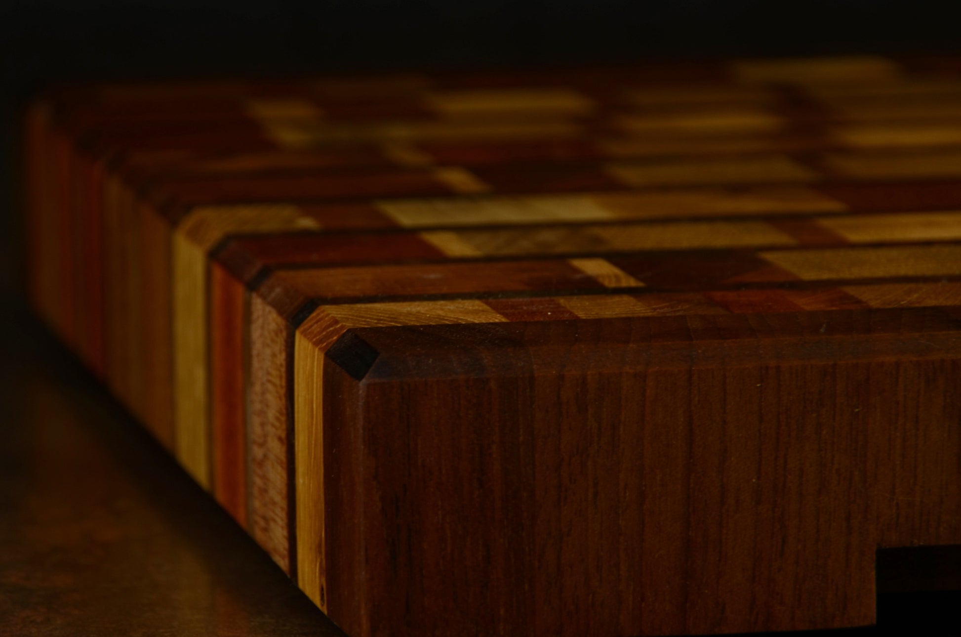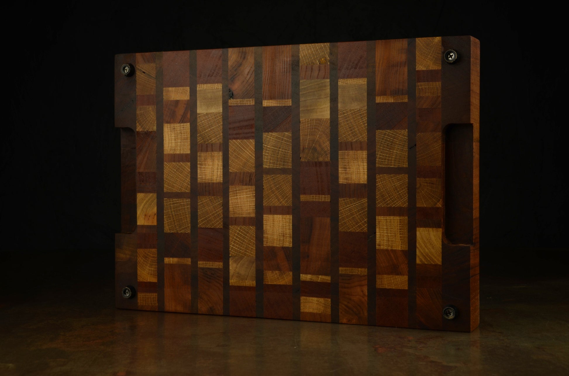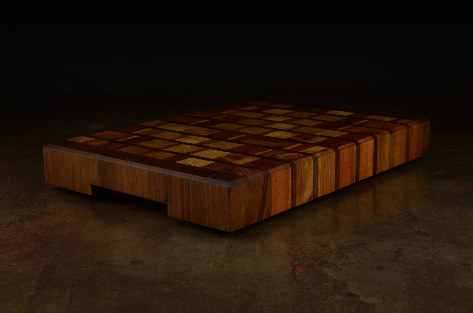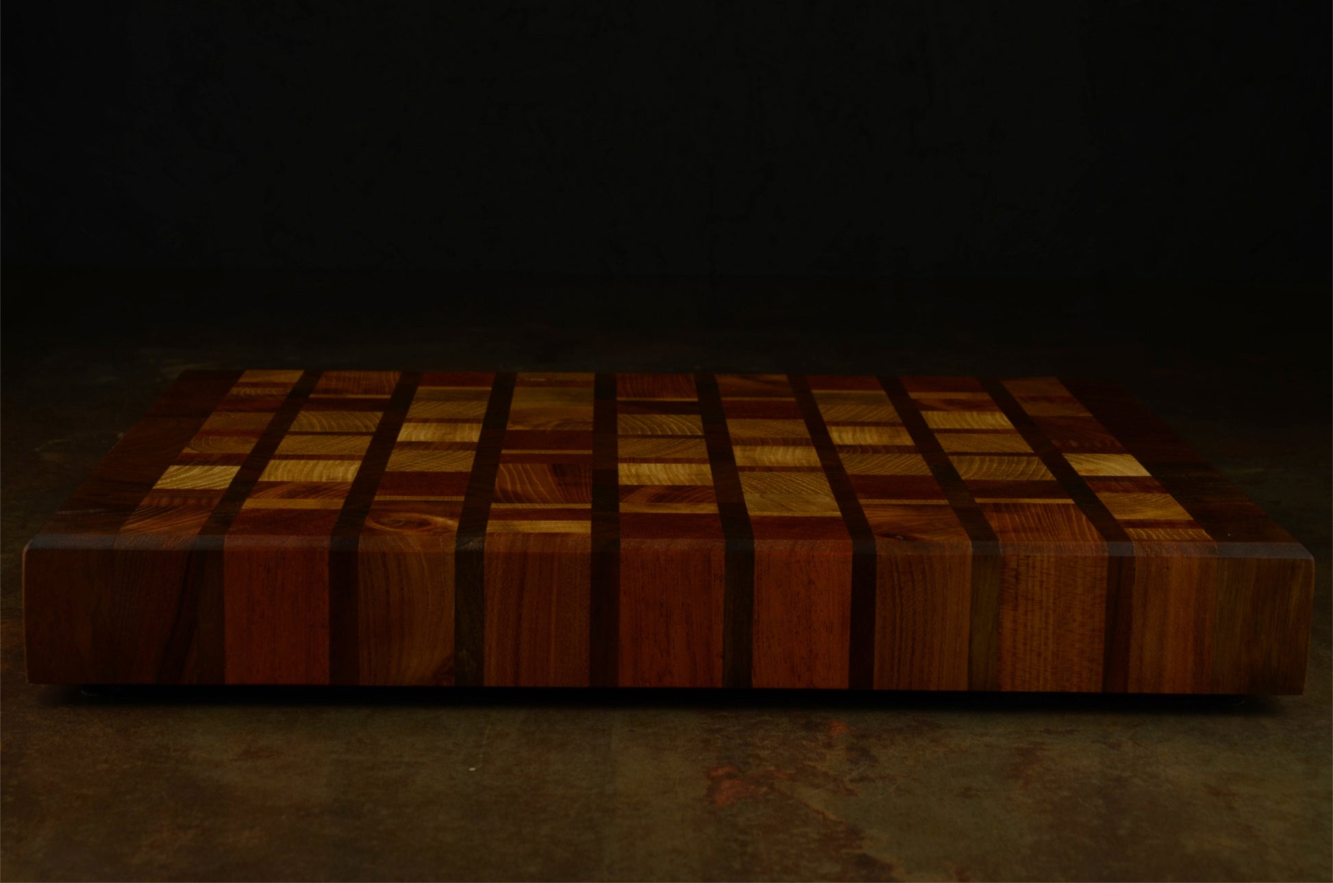 Planche à découper en bois de bout 🌳 fabriquée à la main en France, avec un mélange unique d’essences nobles, principalement du noyer.