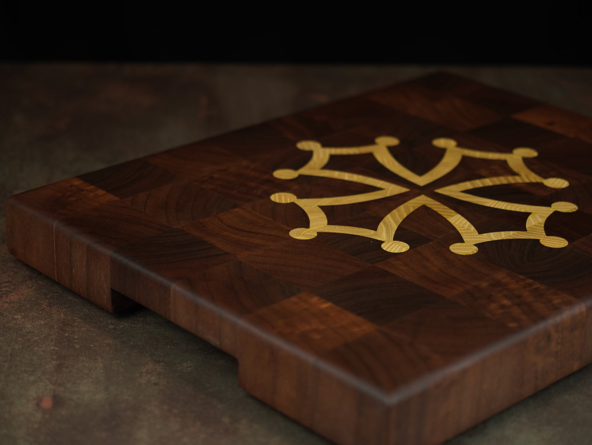 Affichez fièrement vos racines avec ce billot d'exception rendant hommage à l'Occitanie. 🌳 L'alliance profonde du Noyer Sombre et l'éclat solaire de l'Acacia en incrustation crée un contraste puissant, mettant en valeur la célèbre croix du Languedoc avec une précision artisanale.