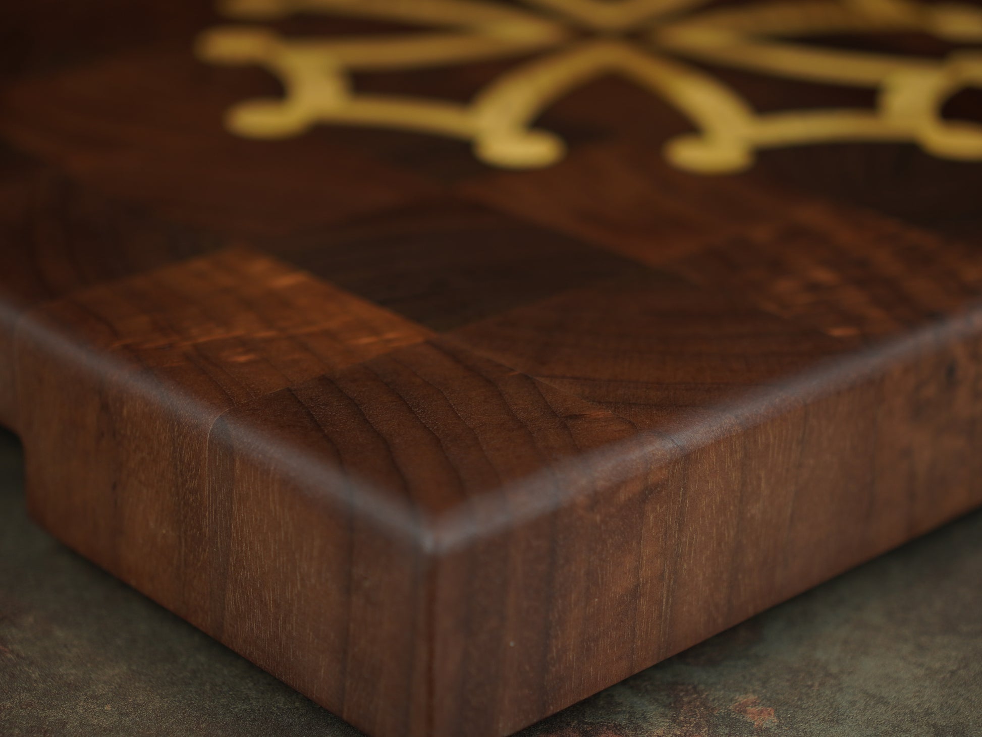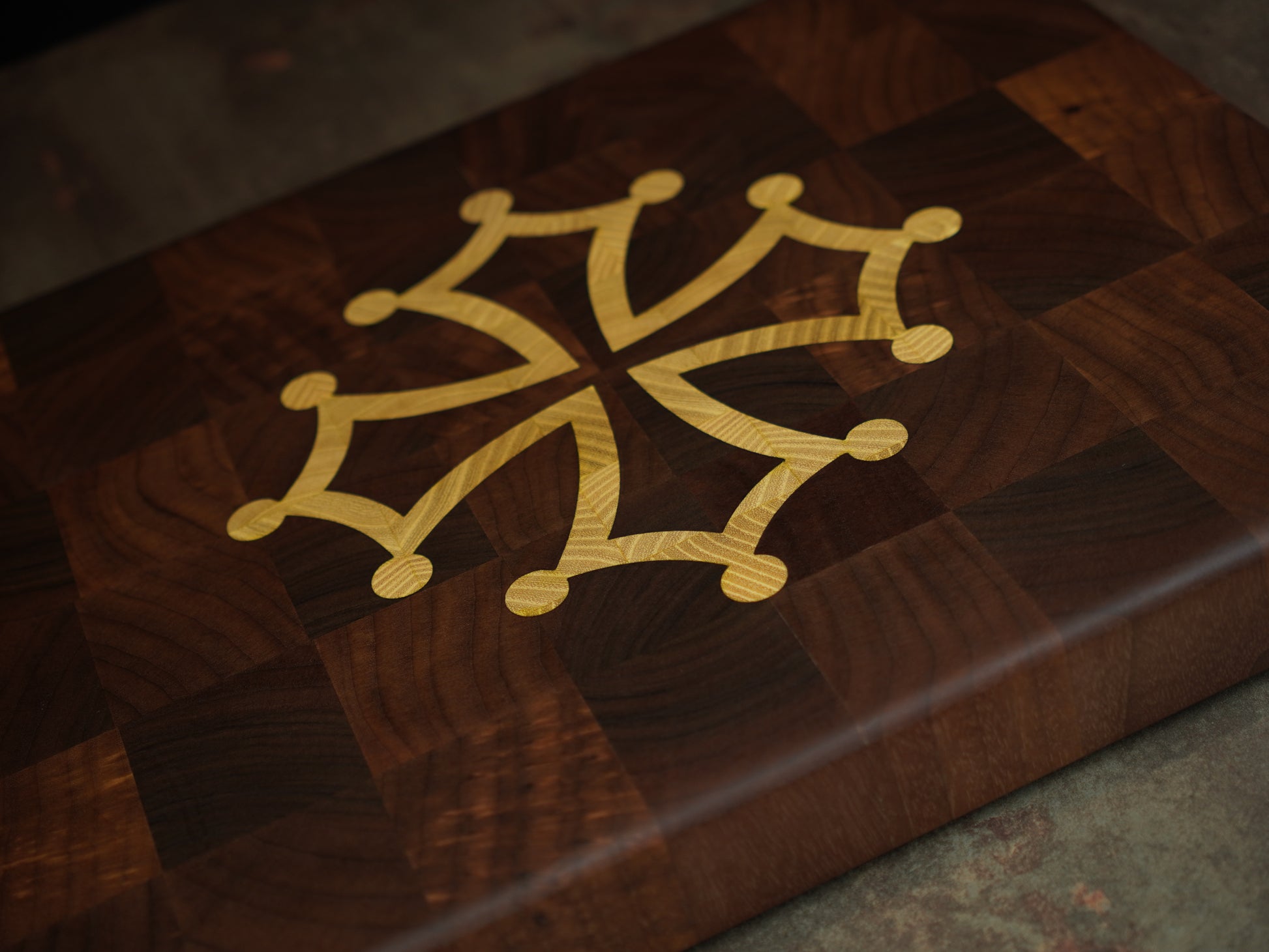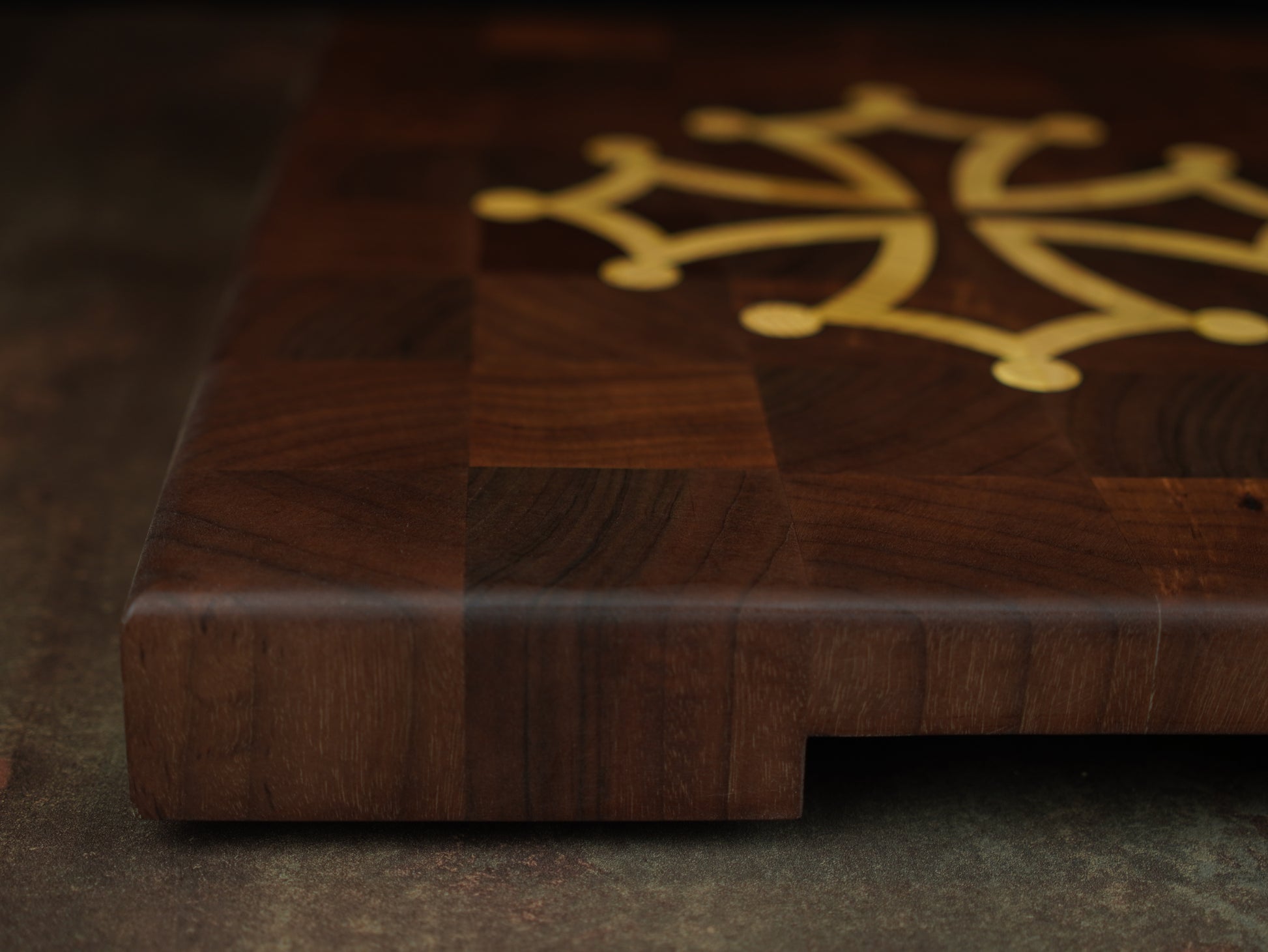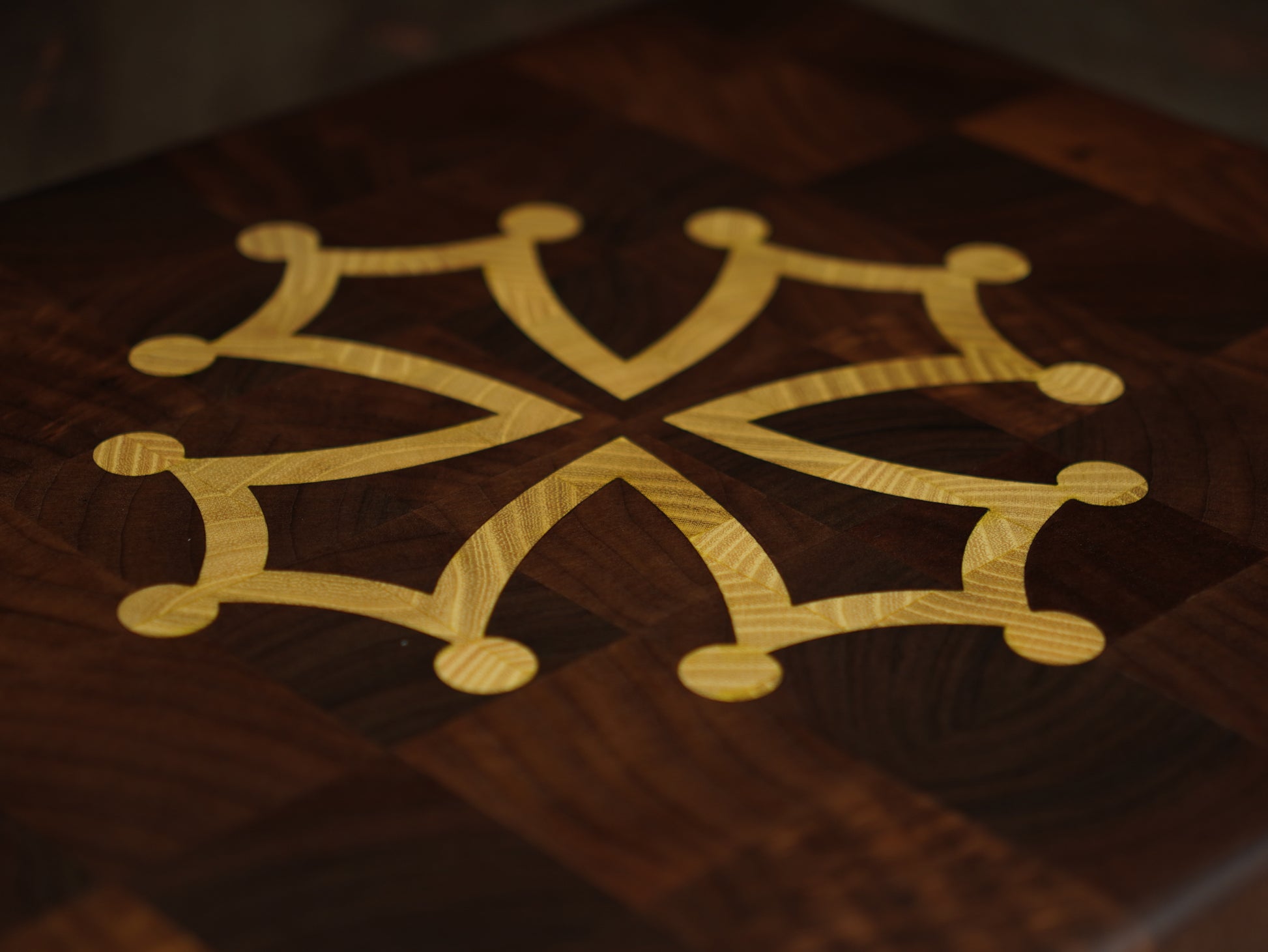 ✅ Essences : Noyer Sombre & Incrustation Acacia (Bois de bout) ✅ Design : Croix Occitane & Poignées fraisées ✅ Finition : Baume naturel cire d'abeille & huile minérale