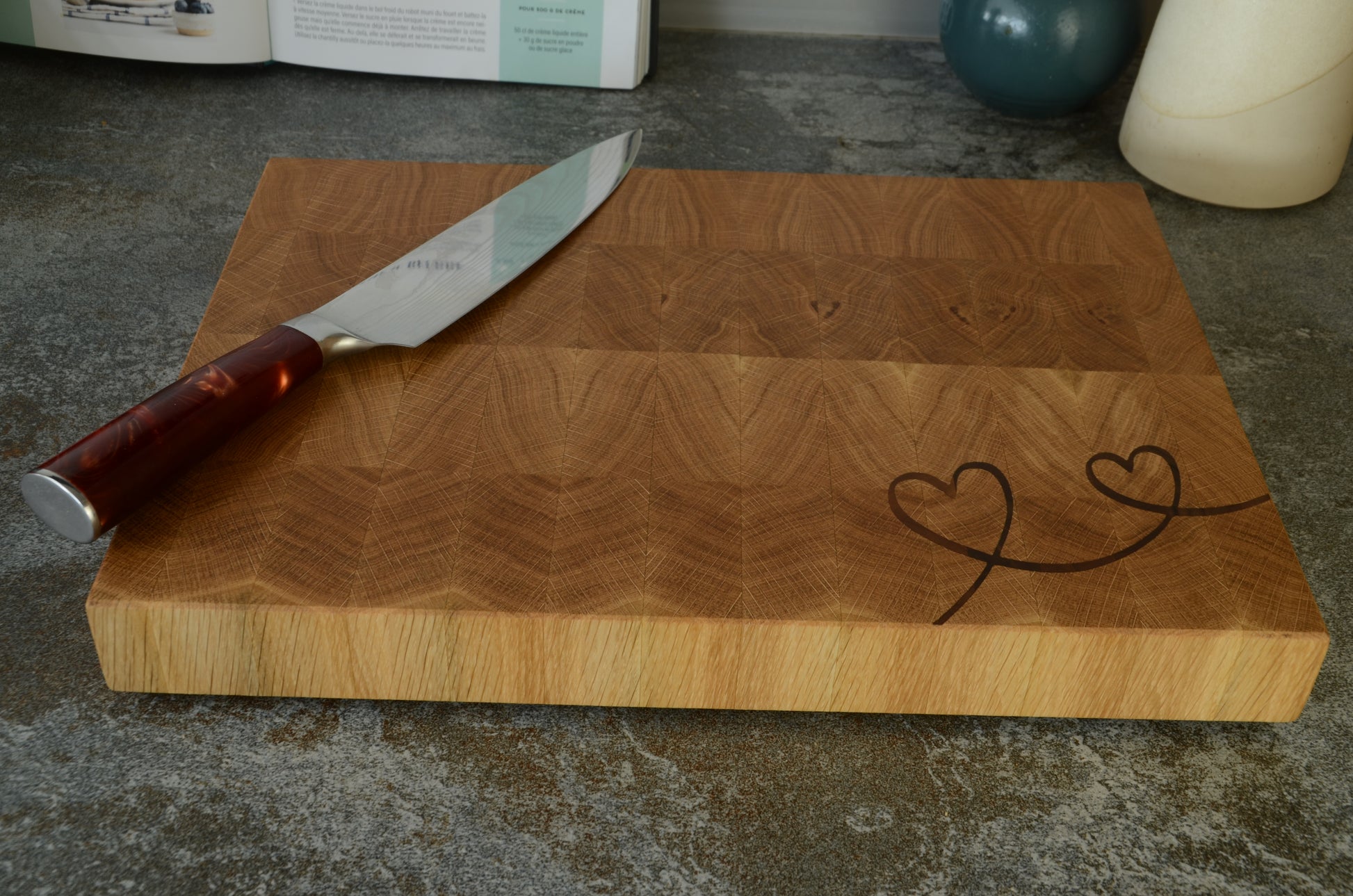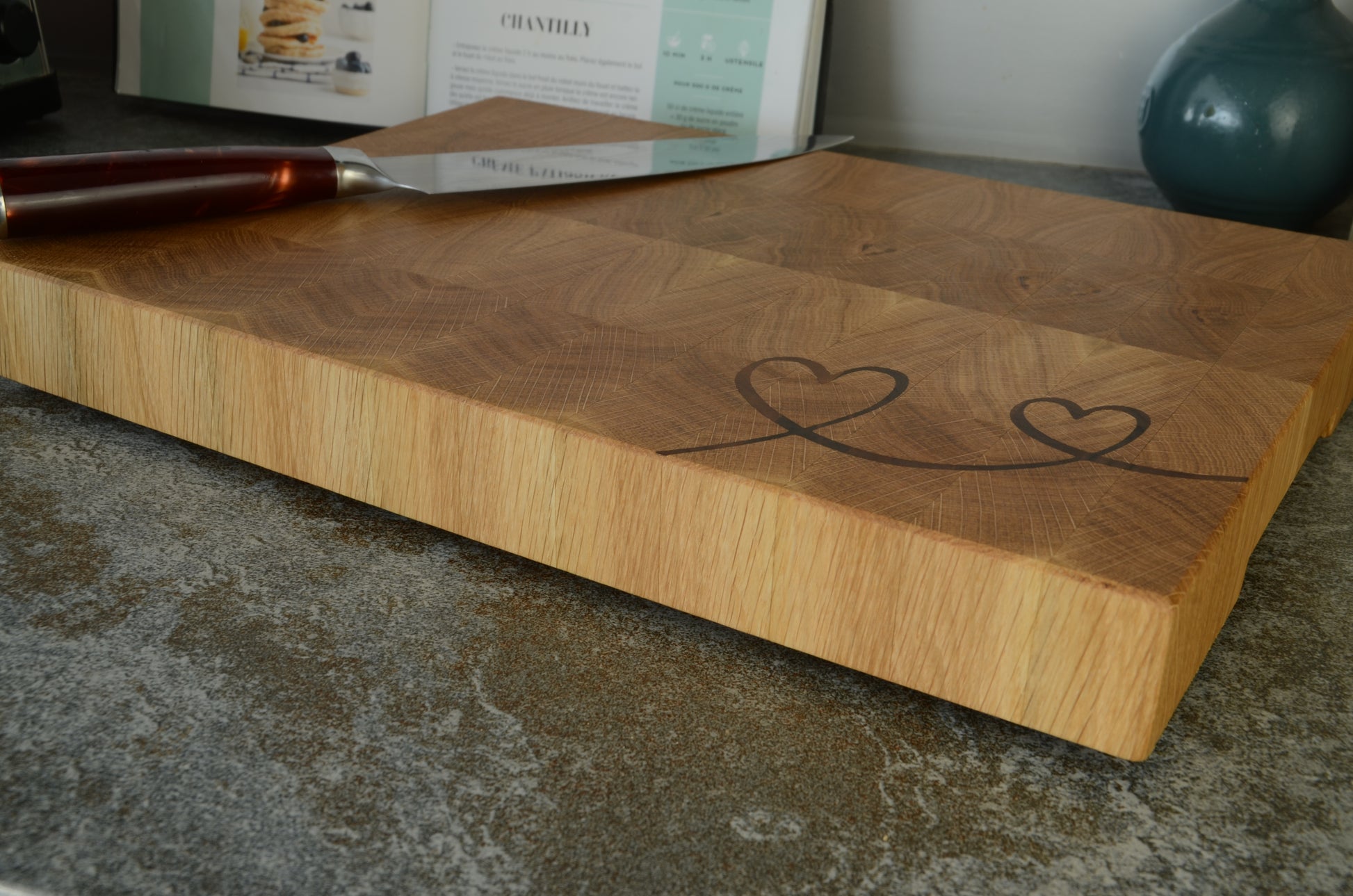 Offrez une touche d’amour et d’artisanat à votre cuisine avec cette planche à découper en chêne massif, rehaussée de cœurs incrustés en noyer. Conçue en bois de bout pour une résistance optimale, elle allie élégance, durabilité et fonctionnalité. Faite à la main, c’est le cadeau parfait pour la Saint-Valentin, un anniversaire ou simplement pour faire plaisir à un passionné de cuisine.