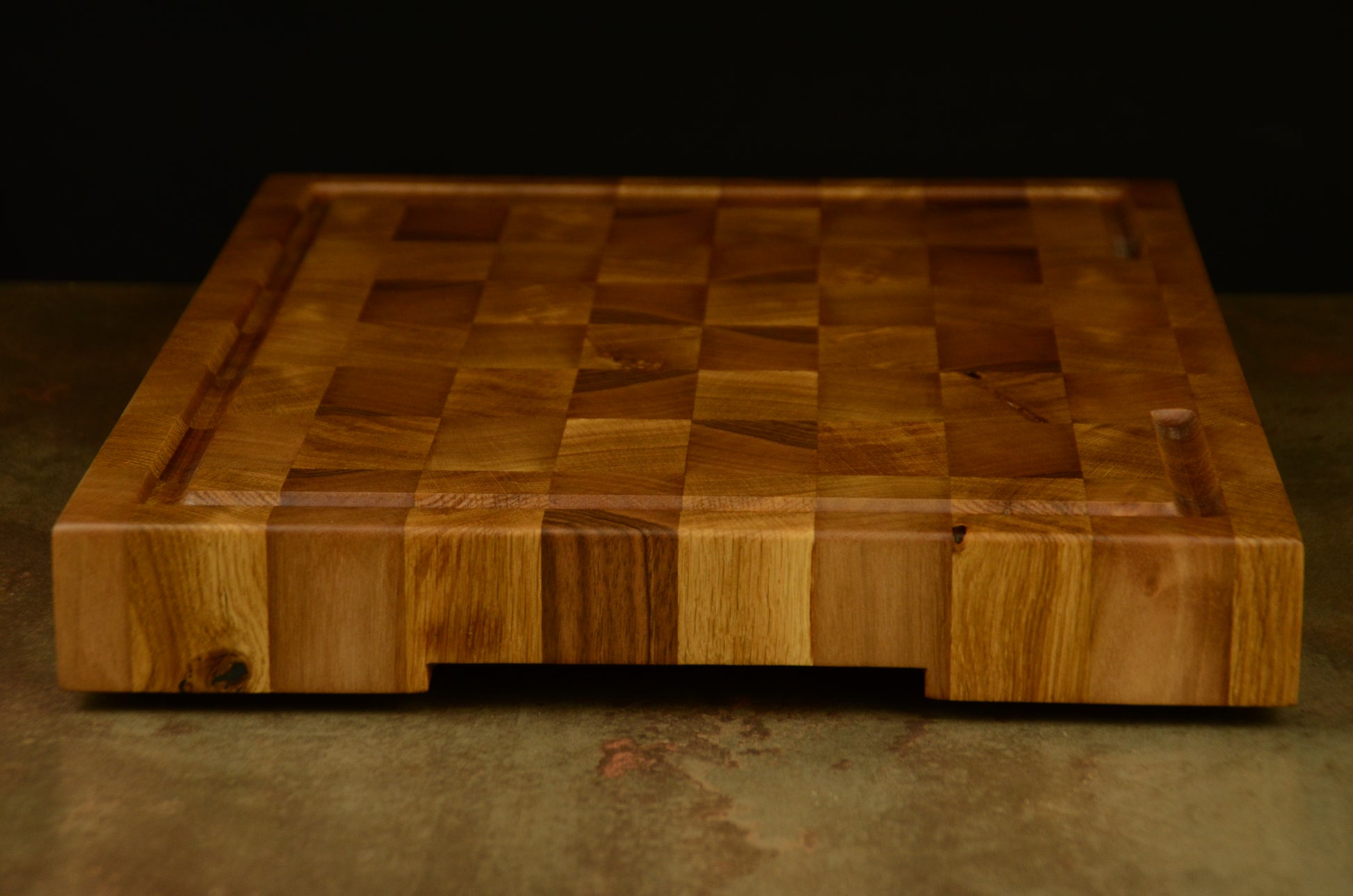 Fabriquée artisanalement en chêne massif et noyer, cette planche en bois de bout est conçue pour durer. Son motif en damier unique apporte un style raffiné à ta cuisine, tout en protégeant tes couteaux grâce à une surface plus douce et résistante.