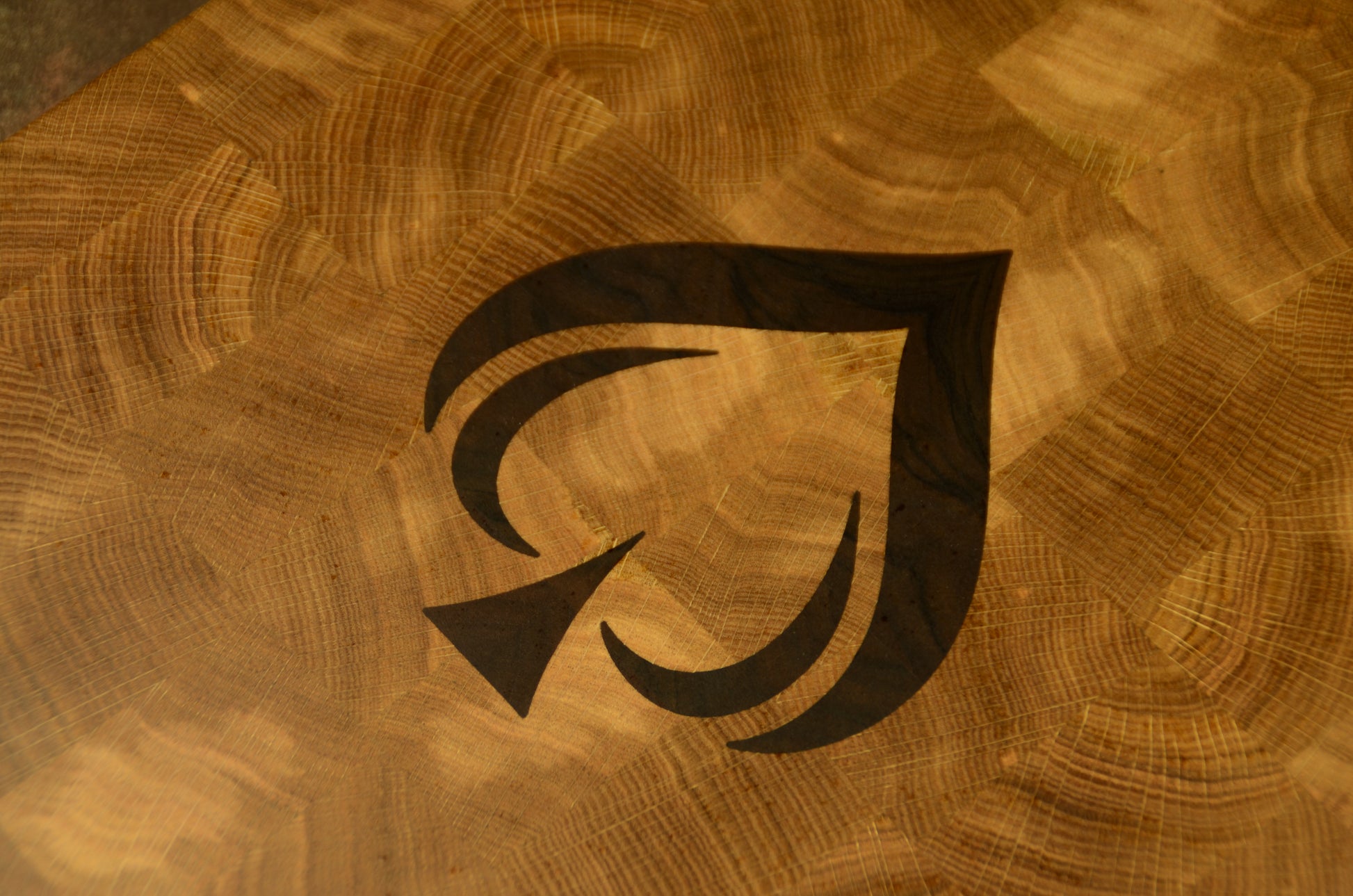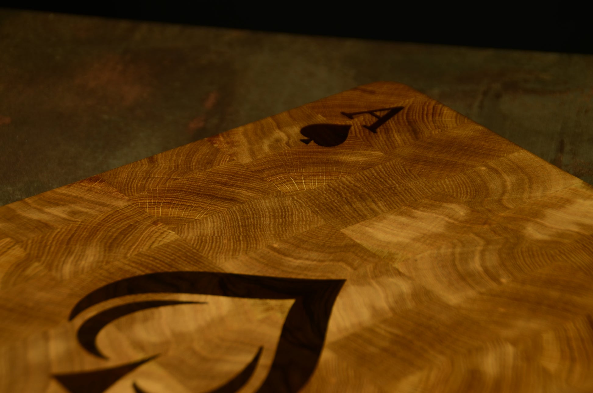 Design Audacieux : Un motif As de Pique finement incrusté en Noyer noir sur un Chêne lumineux. Le contraste est spectaculaire et idéal pour la présentation.